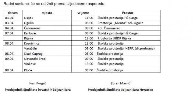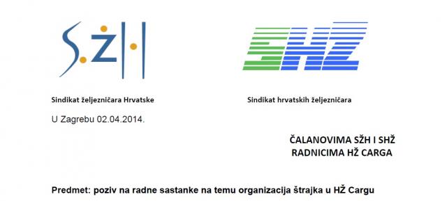 Sindikat željezničara Hrvatske i Sindikat hrvatskih željezničara pozivaju sve članove i sve zainteresirane radnike HŽ Carga na radne sastanke koji će se organizirati u njihovim mjestima kako bi dobili odgovore na mnoga pitanjašto bolje iskoordinirali provedbu štrajka.